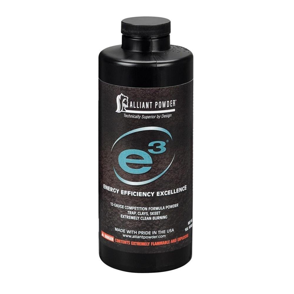 Alliant Powder's new e3 represents the next generation of reloading powder technology and offers the clay target shooter what he/she needs to maintain the winning edge. This 12 ga powder possesses a perfect balance of the qualities desired by competitive shooters. e3 features reduced charge weights is the cleanest burning 12 ga. shotshell powder available and has environmental stability and ultra premium quality to provide more consistent and reproducible performance all-year round. It is destined to become the shot shell powder by which all others are judged and like all of Alliant's flake powders it is proudly made in the USA. Named after its core qualities of energy efficiency and excellence this exciting new powder offers 12-gauge target shooters a high-performance product that stands apart from the rest.