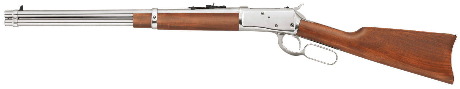The R92 lever action carbine features a stainless steel barrel, a polished stainless finish, a Brazilian hardwood stock, and a fixed/adjustable Buckhorn sight.