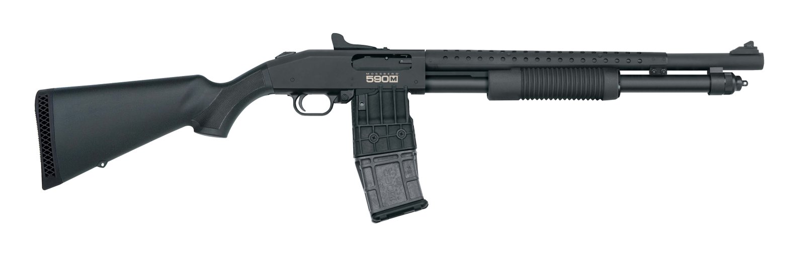 For home security, tactical and competition applications, the 590M pump-action offers many practical advantages such as faster reloading/unloading, increased capacity without additional magazine tube length and quick and easy transitioning between several types of loads. It features dual extractors, twin action bars, positive steel-to-steel lockup, drilled/tapped receiver, ambidextrous safety and a heavy-walled barrel. This model has 18.5" heavy-walled barrel with a heat shield, Cylinder Accu-Choke, ghost ring sights and a 10-round magazine capacity.