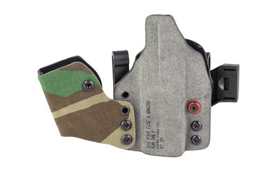 An ergonomic, mission-adjustable, RDS-compatible, multi-positional, deep concealment IWB hybrid thermoplastic holster. Its distinctive features enable concealed carry for a wide range of handgun fits from various carry positions while allowing a full firing grip prior to drawing. The design includes passive retention and adjustable tension, enabling a finely tuned fit and smooth draw. This evolution of the IncogX features a series of clips that provide more adaptability to the user while maintaining the original goals of improved grip, concealment, and function. The clips open outward and slide down with the holster, naturally locking over the belt. An actuated finger tab flexes to open, allowing quick installation or removal from the belt. An improved clip strut design combines functionality with customized concealment shims that can be easily installed or removed without tools. All IncogX models come with clip strut shims in three different concealment sizes: 1/8", 1/4", and 3/8".